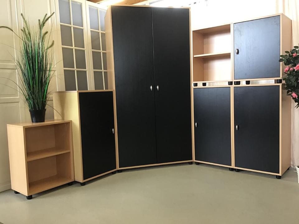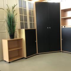 Das siebenteilige Jugendzimmer in Buche mit schwarzen Türen besteht aus Kleiderschrank, zwei Standregalen, drei Regalschränken hoch und einem Regalschrank niedrig (Maße auf Anfrage)