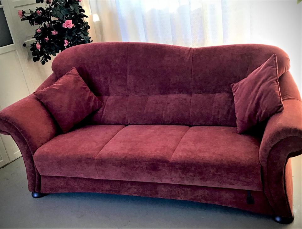 Das stoffbezogene rote Sofa mit 2 Kissen hat die Maße 200 cm x 98 cm x 90 cm