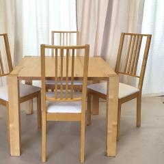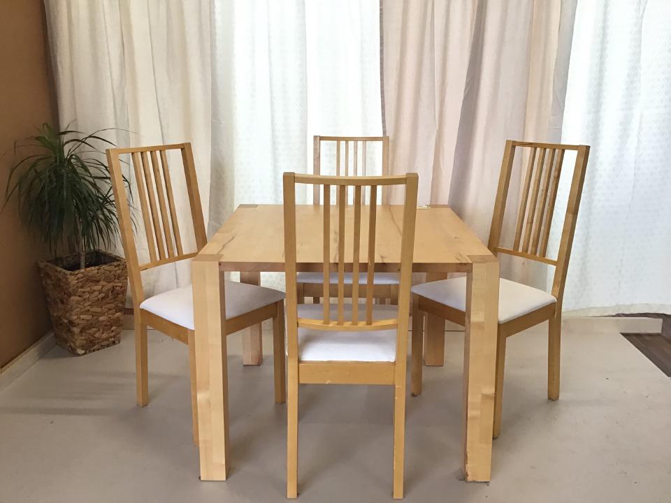 Der Vollholztisch aus Birkenholz, inklusive vier weißen gepolsterten Stühlen, die Maße sind 90 cm x 90 cm x 73 cm