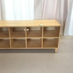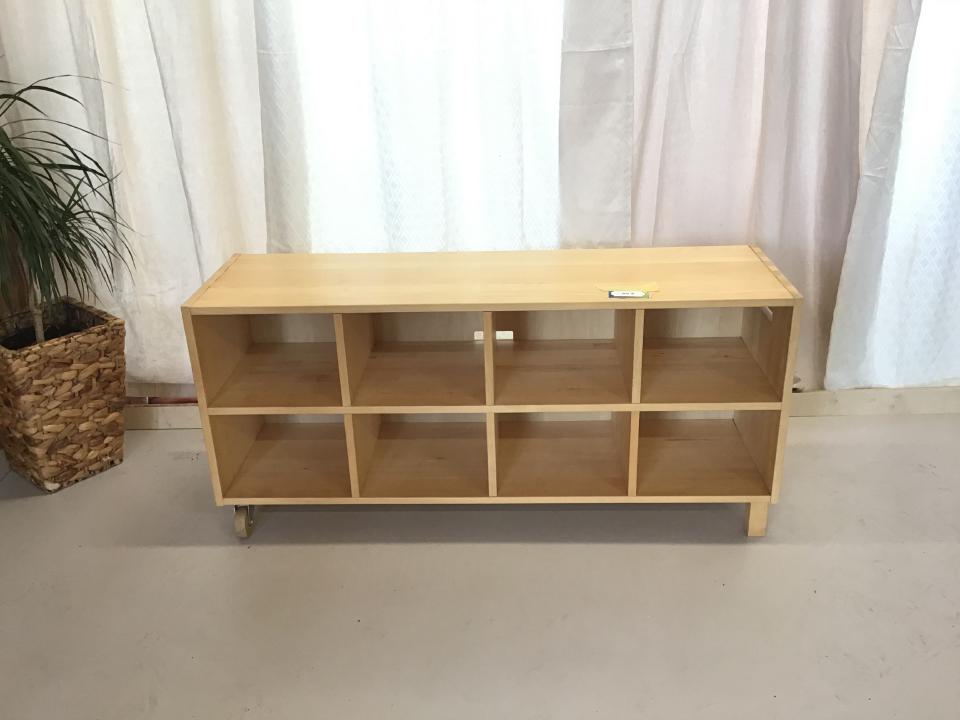Das rollbare Lowboard ist aus hellem Birkenvollholz mit Fächern, die Maße sind 130 cm x 38 cm x 60 cm
