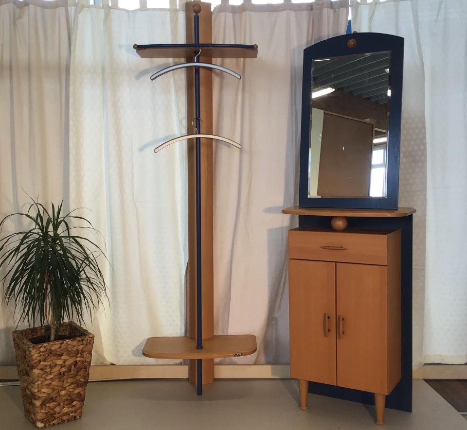 Die dreiteilige Garderobe in blau aus Buchevollholz hat einen Spiegel 85 cm x 50 cm, eine Kommode 103 cm x 63 cm x 27 cm und ein Wandpaneel