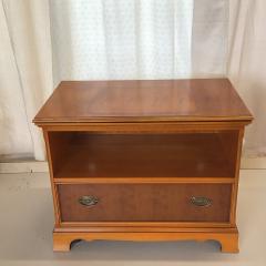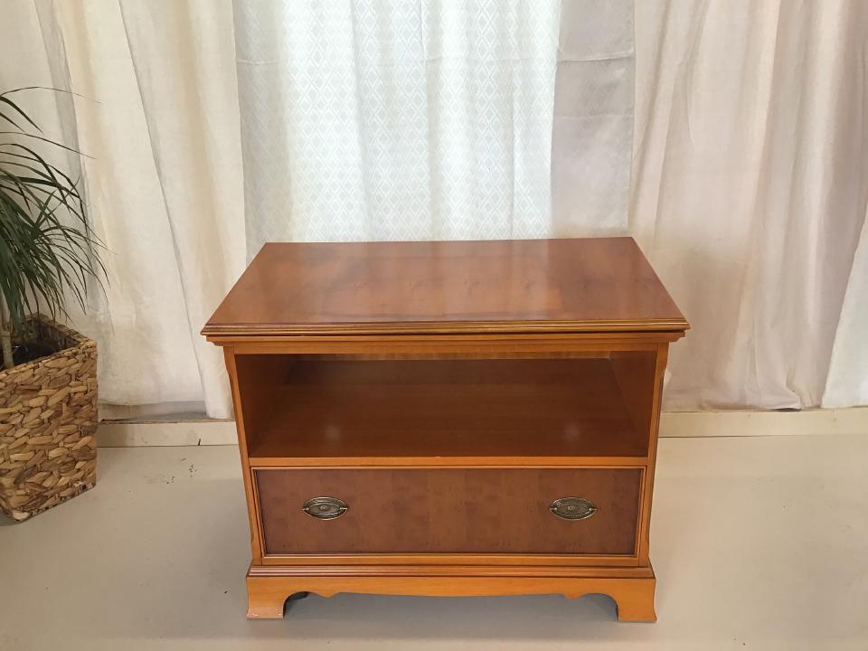 Die dunkle Kirschholzkommode in Antikoptik besitzt eine Schublade sowie ein offenes Fach, die Maße sind 84 cm x 47 cm x 68 cm