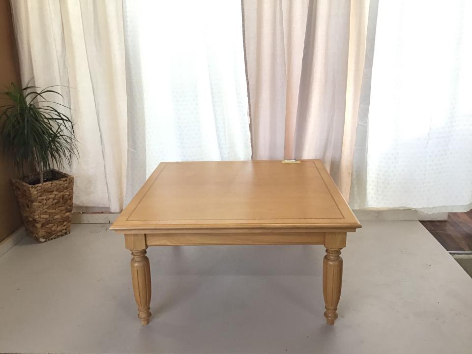 Der helle Vollholztisch aus Buchenholz mit schönen Intarsien verziert, die Maße sind 105 cm x 105 cm x 53 cm