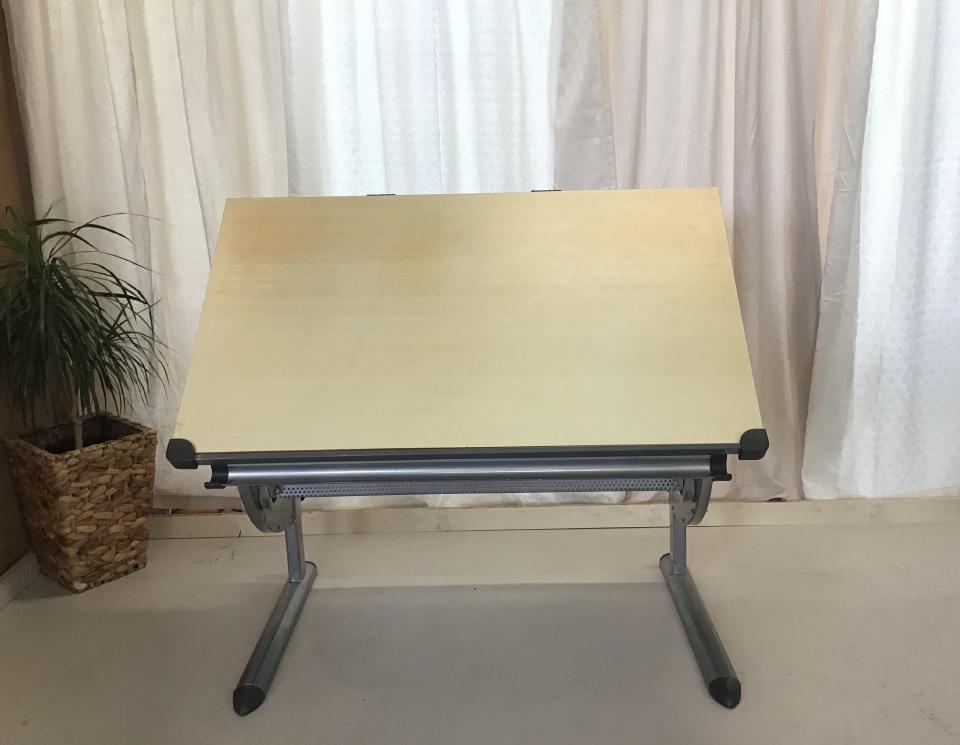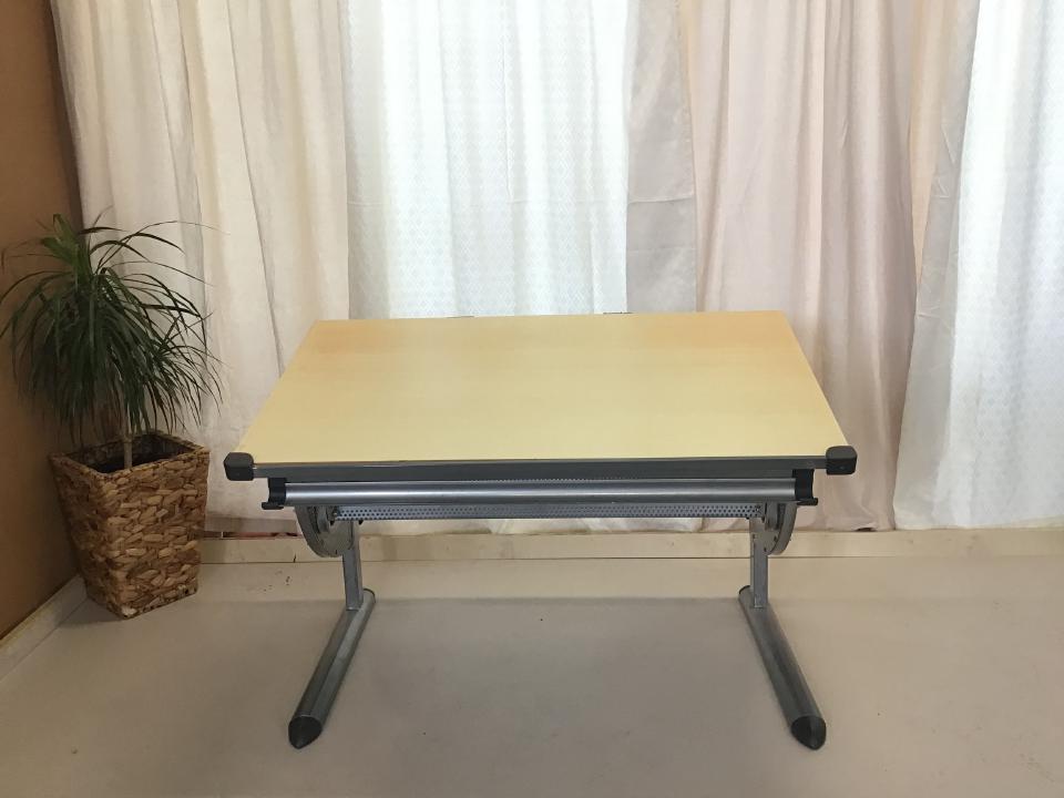 Der kippbare Schreibtisch in Buchenholzoptik besitzt ein Metalluntergestell und ist höhenverstellbar, die Maße sind 115 cm x 70 cm