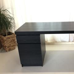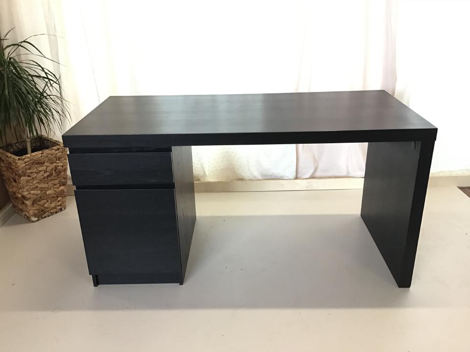 Der schlichte mattschwarze Ikea Schreibtisch besitzt zwei geschlossene verschließbare Fächer, die Maße sind 140 cm x 65 cm x 75 cm